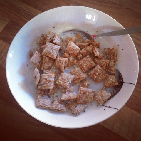 Me - I had mini shredded wheats with organic Rice Dream milk and I also sprinkled on a tablespoon of chia seeds and sesame seeds which are a really good source of calcium. I had Twinings Rose Garden tea to drink.